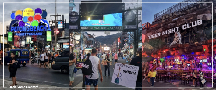 Depois, a tal Bangla Walking Street… que é como uma Khao San Road mas em esteróides! Mais bares, maiores e mais barulhentos, casas de espetáculos, algumas coisas degradantes à vista de toda a gente. Já nos tinham dito que parecia destino de despedidas de solteiro ou festas adolescentes, mas isto é um nível ainda acima disso. Há tanto barulho que é quase impossível andar na rua, somos abordados constantemente para tudo e mais alguma coisa. E o que é mais curioso é que nem nos pareceu existirem assim tantos turistas com este tipo de registo mais “arrojado”.